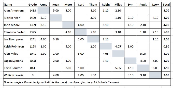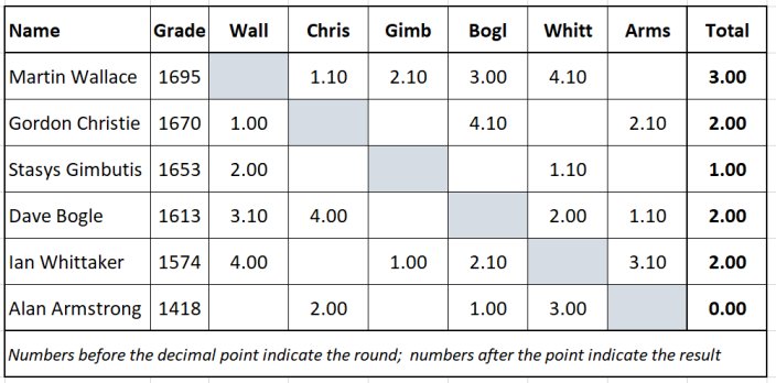 The final results are in from the Minor section: Cameron Carter beat Ian Thompson to take the title; Martin Keen beat Alan Armstrong; Alan Miles and Kevin Poulton drew their game; and William Lawrie beat Logan Symons. Congratulations to Cameron Carter! The new tables are below.Minor section