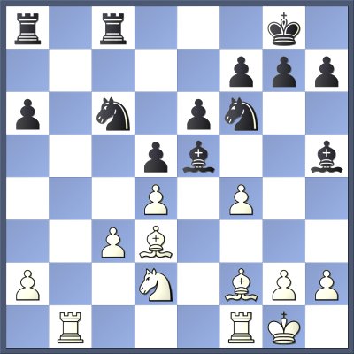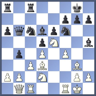 White in turn has a long think before castling, which is the best move. Qc7 adds a third attacker to the strong knight on e5 and connects the Black rooks. Stockfish marginally prefers Rc8 (with a threat to White’s d5 pawn. Black does of course want a rook on c8; however, as Black’s counterplay will be on the queenside (the direction in which the pawns are pointing), there is a case for moving the king’s rook to c8, and keeping the queen’s rook on the queenside.