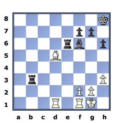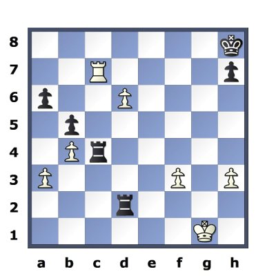 In this position White (though a Rook down) understandably played on, as he was hoping that his d-pawn would prove unstoppable. But Black forced resignation with the move Rc4, which attacks (i) the White Rook and (ii) the square c1.