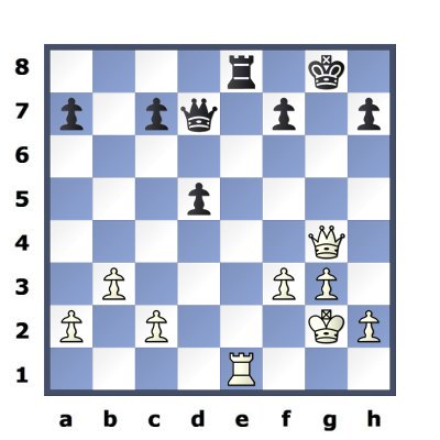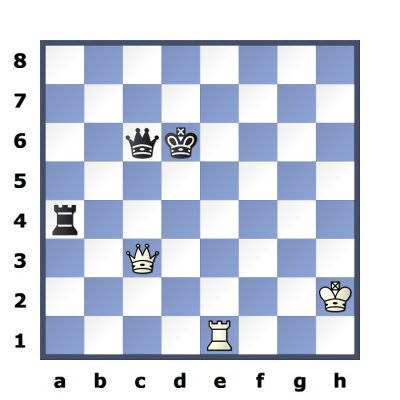 White plays Re6+, skewering the King and Queen. Black can capture the Rook, but that leaves the Black Queen undefended. Qxc6+ wins a Queen for a Rook.