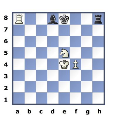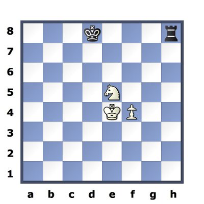 By taking the Black Bishop, White forces the King to d8 (diagram 2) and now the Knight can jump in at f7, forking the King and the Rook. White ends up with King, Knight and Pawn against a lone King, which is a winning position.