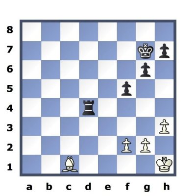 With the Rook unable to move, you might think that capturing it would be the best move. Not so, for after the Bishop takes the Rook and the Black King takes the Bishop, White is left a pawn up - which in this position cannot be forced through to promotion to a Queen.