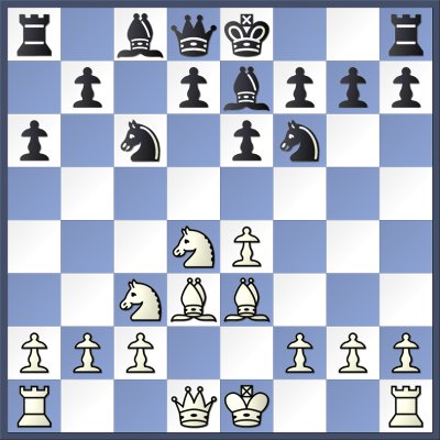 8.Nxc6 bxc6 9. e5 Nd5 10. Nxd5 cxd5 11. Qg4 Kf8 12. Bd4 h5 13. Qf3 Kg8