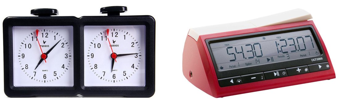The two types of clocks are shown above: there are analogue clocks, which are uncommon now in tournaments (but still used in many clubs); and on the right we see a digital clock. Clocks like these are more accurate and can be programmed with more settings. They are now standard in tournaments.